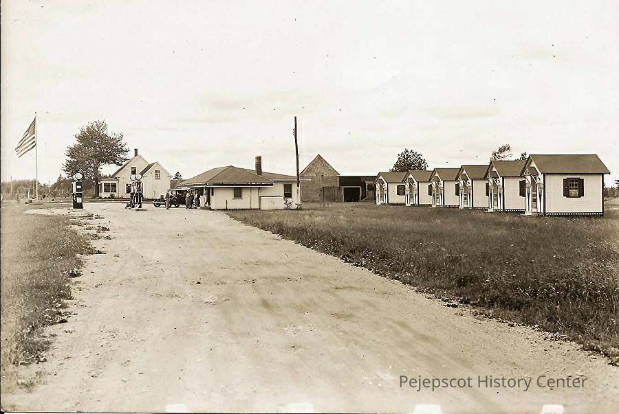 A B/W photograph of a motel at Cooks Corner. There are 5 small cabins and a convenience store and gas station.