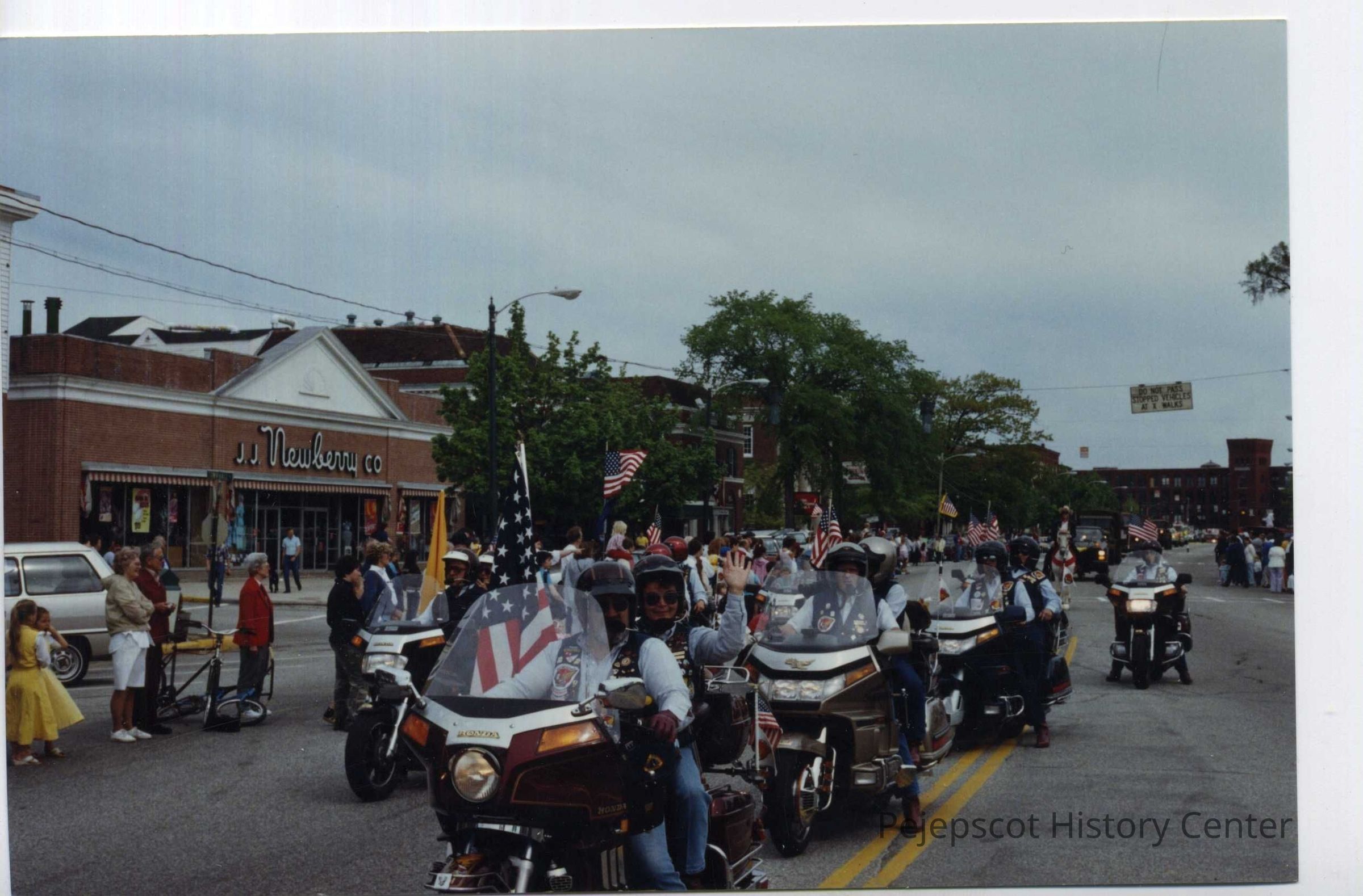 A color photograph of motorcyclists driving down Maine Street in Brunswick at the Desert Storm Welcome Home parade.