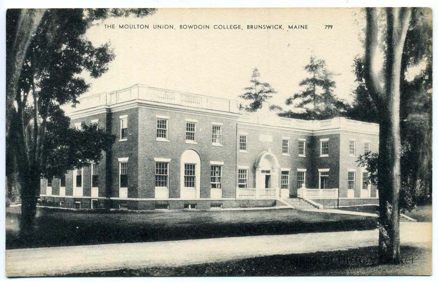 Black & white postcard of the Moulton Union at Bowdoin College.