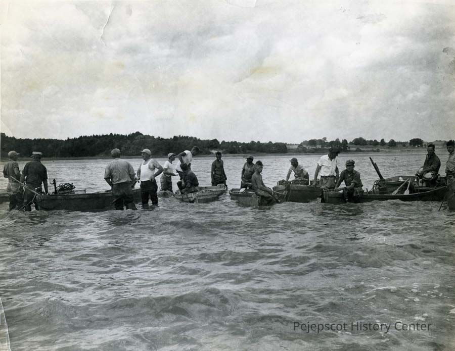 A B/W photograph of part of the crew involved in moving quahogs to areas that didn't have any. Undated 2nd from left: Frank Henly; 4th from left: Jim Hurstrer; 5th from left: Dana Wallace. 4th & 5th from right: Ned Brand, Bill Goodnow