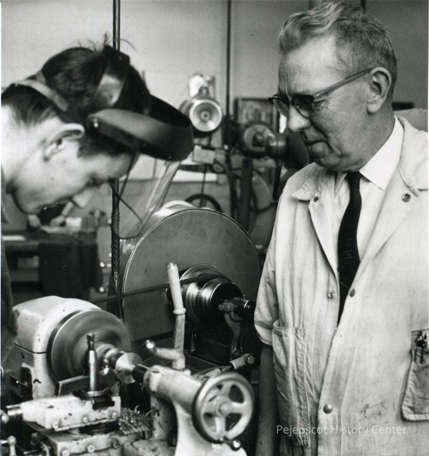 A B/W photograph of Mr John Cole, teacher, and Paul Fournier working with metal in Mechanical Arts Class, Brunswick High School.