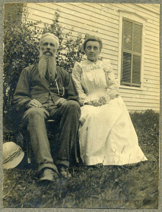 An undated black and white photograph of Mr. and Mrs. Daniel R. Stover sitting outside a house.