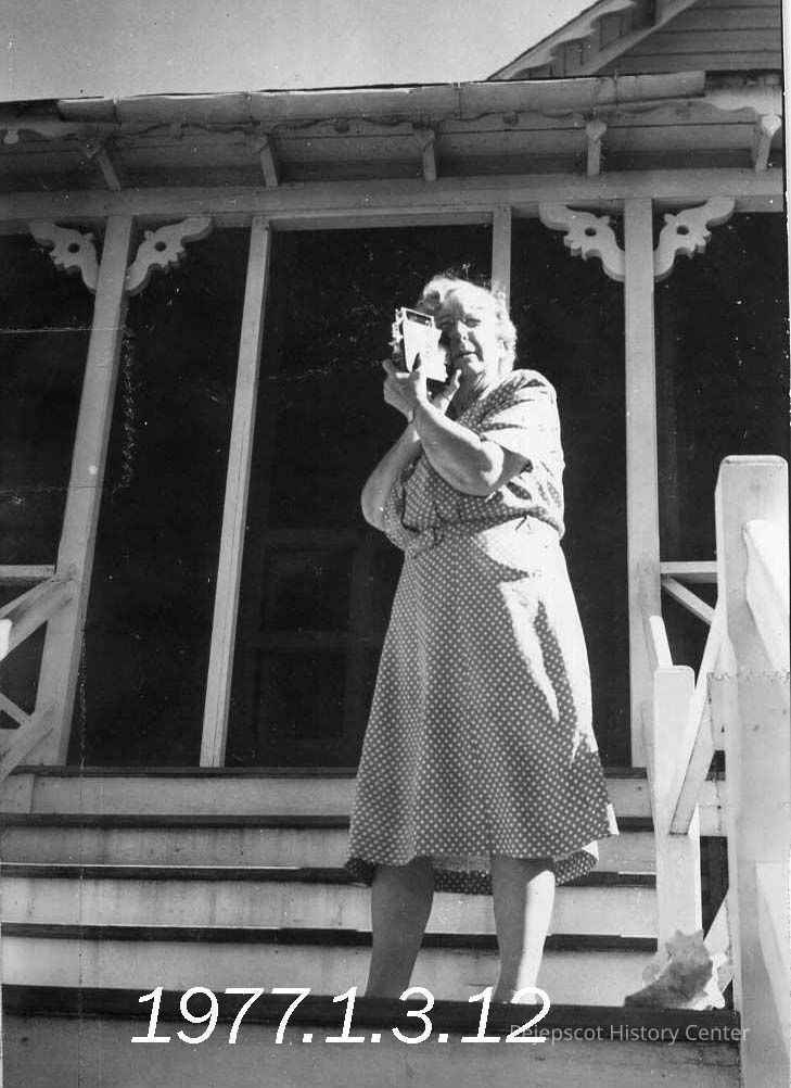 A B/W photograph of Mrs. Al Brehaut taking moving pictures. Undated The accession paper work says, "Misc. snapshots of Mrs. S. Sylvester from her early life".