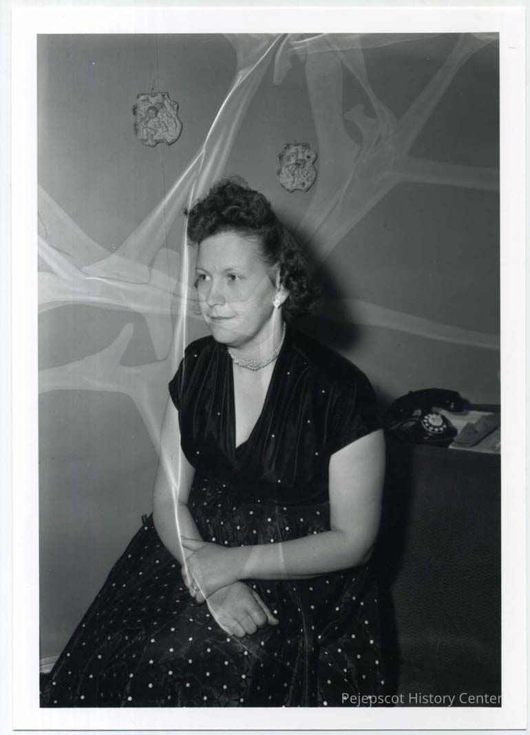 Mrs. Burton Gilliam (Gelene) poses as a Bailey Island candidate for Tax Collector, Eastern Division, on February 4, 1956. She is seated with a telephone on her right and plaques on the wall behind her.