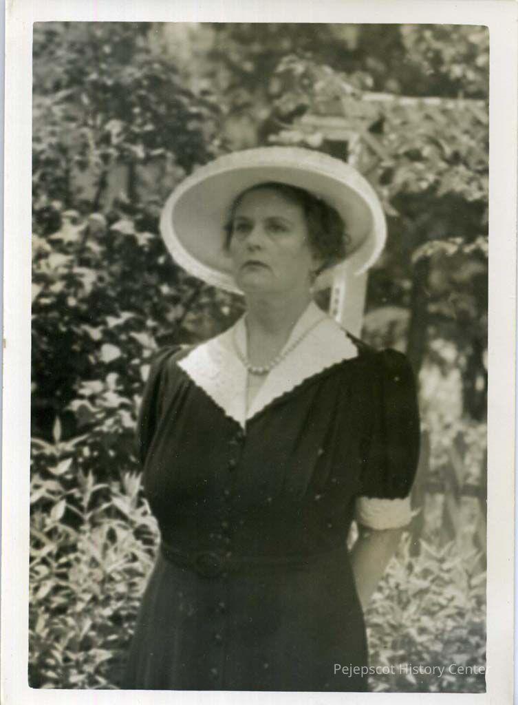 A photo of Mrs. Irving (Ruth) Ormsby taken outside. She is wearing a large white hat. Undated