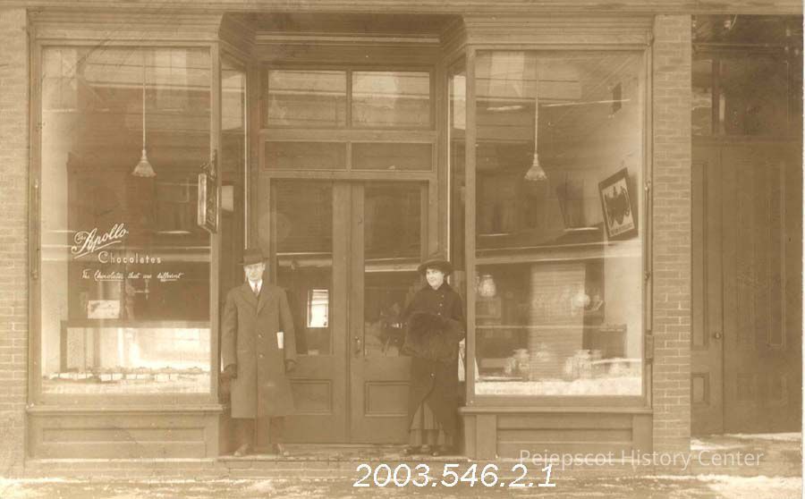 An undated black and white postcard of a man and a woman in front of an unnamed shop. The woman is Mrs. John Green. (or is it Florence Nealy????)