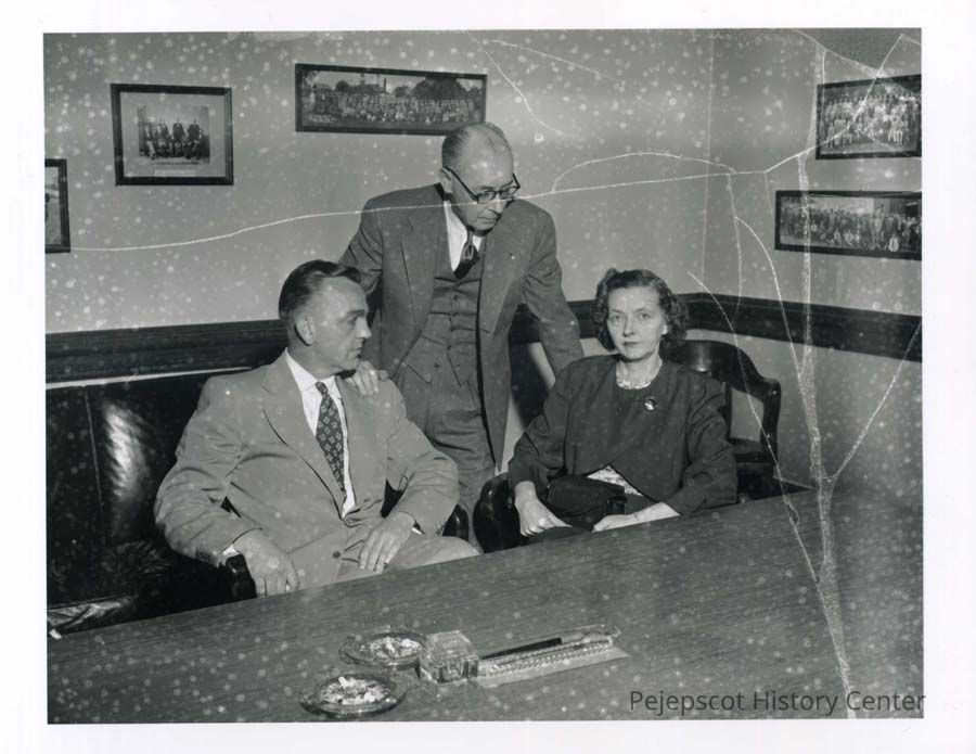 B/W photograph of two men and Mrs. Lancelot Cooper in an office.