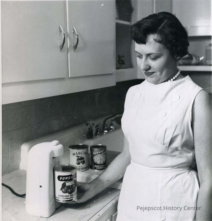 A B/W photograph of Mrs. Laurier Pinette of 64 Water Street, Brunswick, demonstrating one of the can openers her husband made. Undated