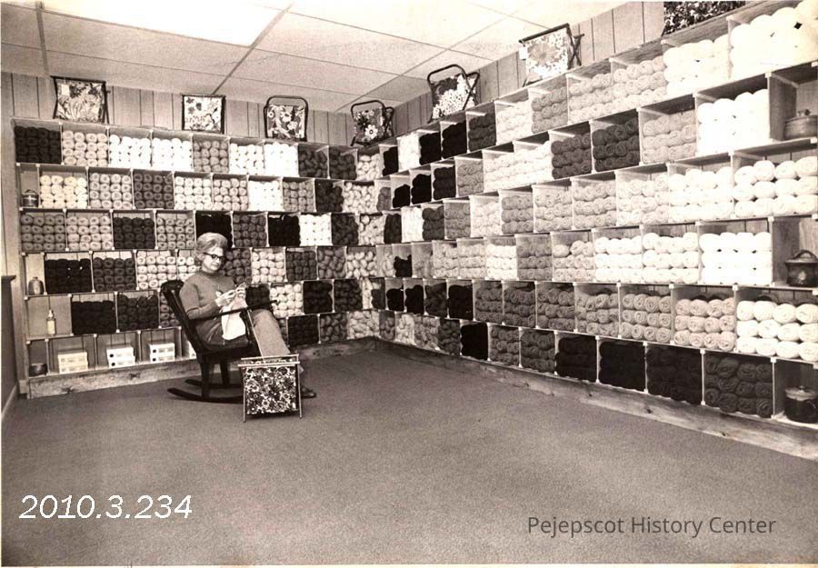 A B/W photograph of Mrs. Marjorie Young owner of The Towne Shoppe on Maine Street. The shop specializes in supplies for knitting, etc.