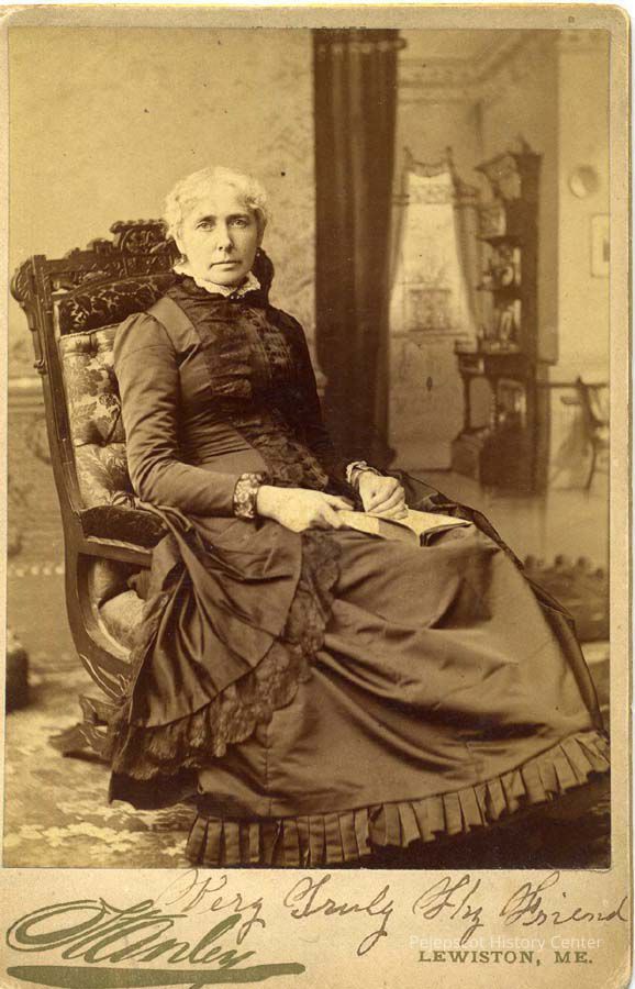 Sepia photograph of Mrs. Mary G. Rand, a woman sitting in ornate chair with a book on her lap.