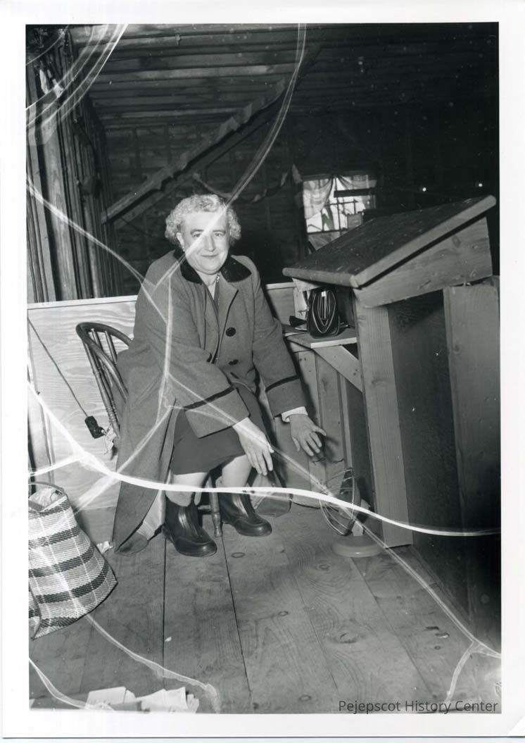 Mrs. Ruth M. Doughty wearing a coat and overshoes warms her hands by a small heater in the Redman's Hall at town election on March 9, 1955.
