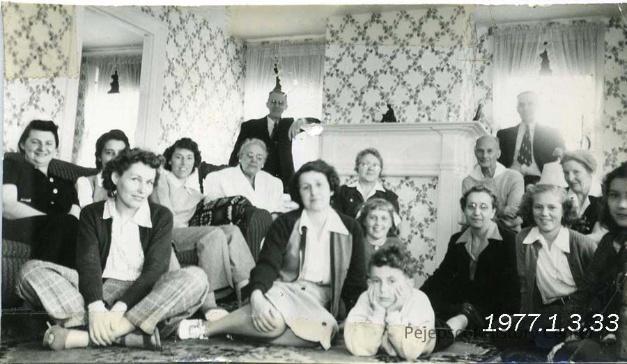 A B/W photograph of people sitting on the floor in a living room. The accession paper work says, "Misc. snapshots of Mrs. S. Sylvester from her early life." First Row (on floor): Melba Bonang, Annie Hasmer, Glen Hasmer, Lorraine Bonang, Mrs. Roy, Louise Bonang. Second Row: Pauline Fournier, ?, Annette Bonang, Mrs. Marshall, Gladys Burns, Frank DeWick, Helen Snow. Standing: Brainerd Burns, Florian Fournier. UndatedCollection