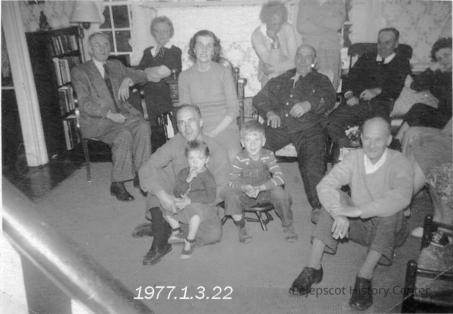A B/W photograph of a group of unknown people sitting in a living room. The accession paper work says, "Misc. snapshots of Mrs. S. Sylvester from her early life." Undated
