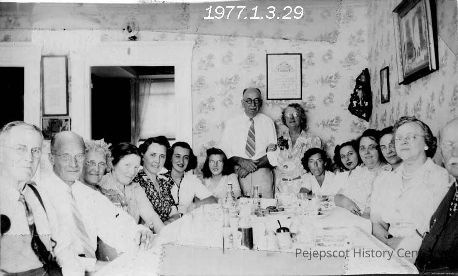 A B/W photograph of a group of people sitting around a table. The accession paper work says, "Misc. snapshots of Mrs. S. Sylvester from her early life." L-R: Brainard Burns, Frank DeWick, Mary Lilly, Helen Snow, ?, Gloria Fortin, ?. Standing: Mr. Brehaut; Mrs. Brehaut, Annette Bonang, Loretta Fortin, Helen Ormsby, Herman Toothaker, Gladys Burns. UndatedCollection