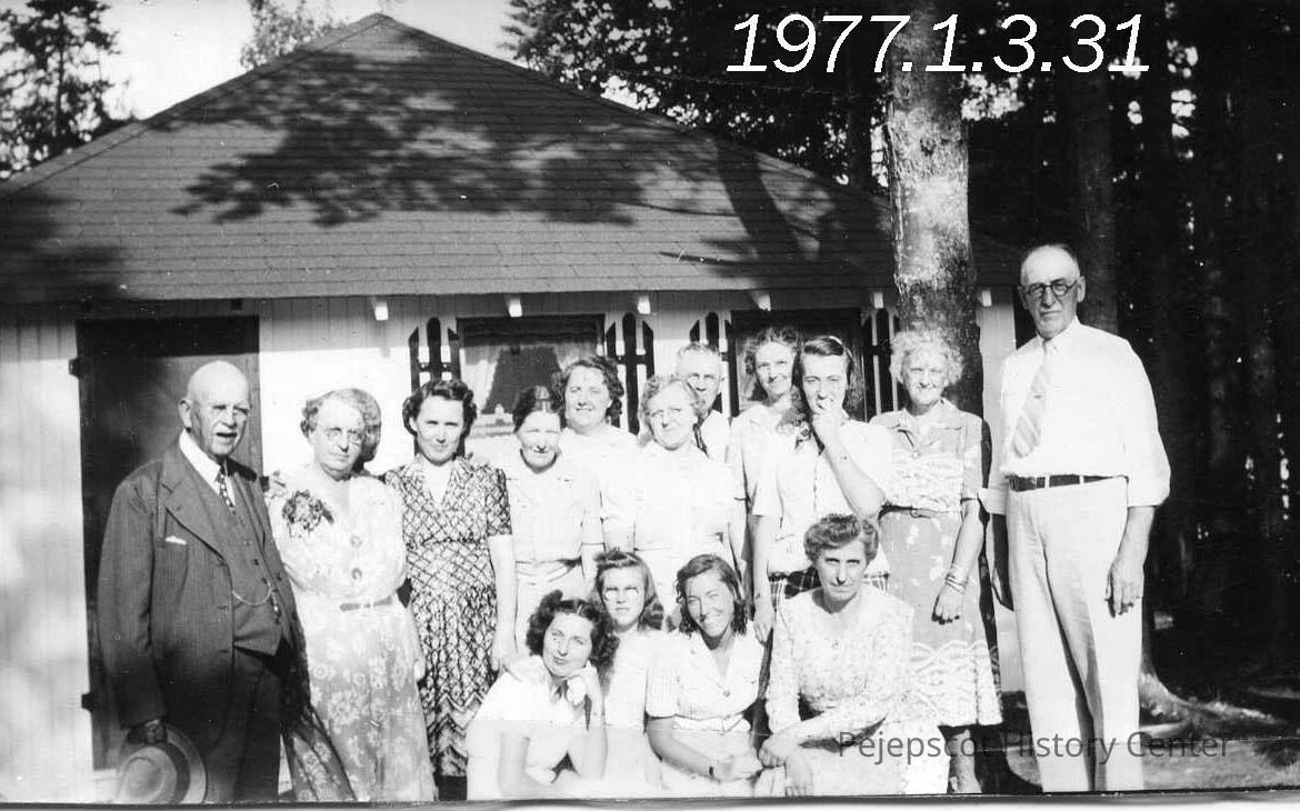 A B/W photograph of group of people. The accession paper work says, "Misc. snapshots of Mrs. S. Sylvester from her early life." Standing: Mary Lilly's father, Elsie Brehaut, ?, Helen Snow, Helen Ormsby, Gladys Burns, (B. Burns), ?, Mary Lilly, Alexander Brehaut. Sitting: Loretta Fortin, ?, Annette Bonang, Lillian Marshall. UndatedCollection