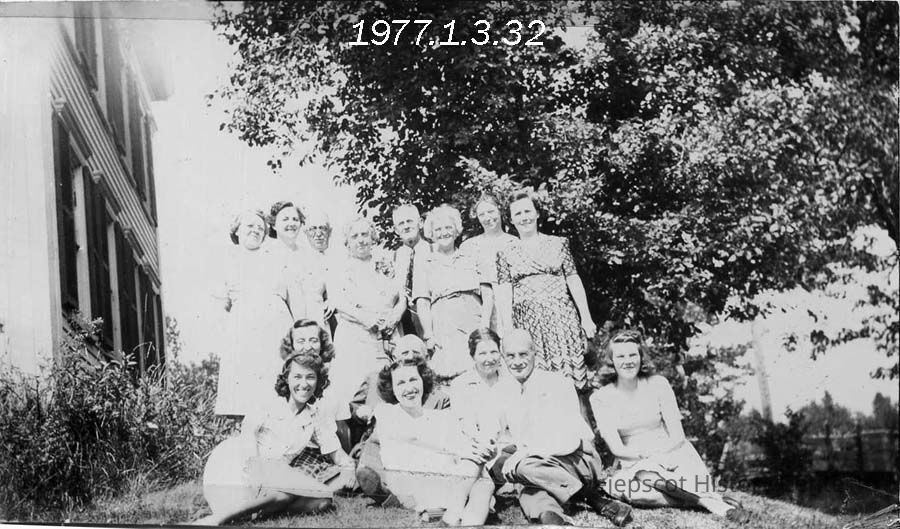 Seated: Annette Bonang, Loretta Fortin. Second Row: ?, ?, Helen Snow, Frank DeWick, ?. Back: Gladys Burns, Helen Ormsby, Mr. Brehaut, Elsie Brehaut, B. Burns, Mary Lilly, Herman Toothaker. Taken at Mary Lilly's home in Bowdoinham. UndatedCollection