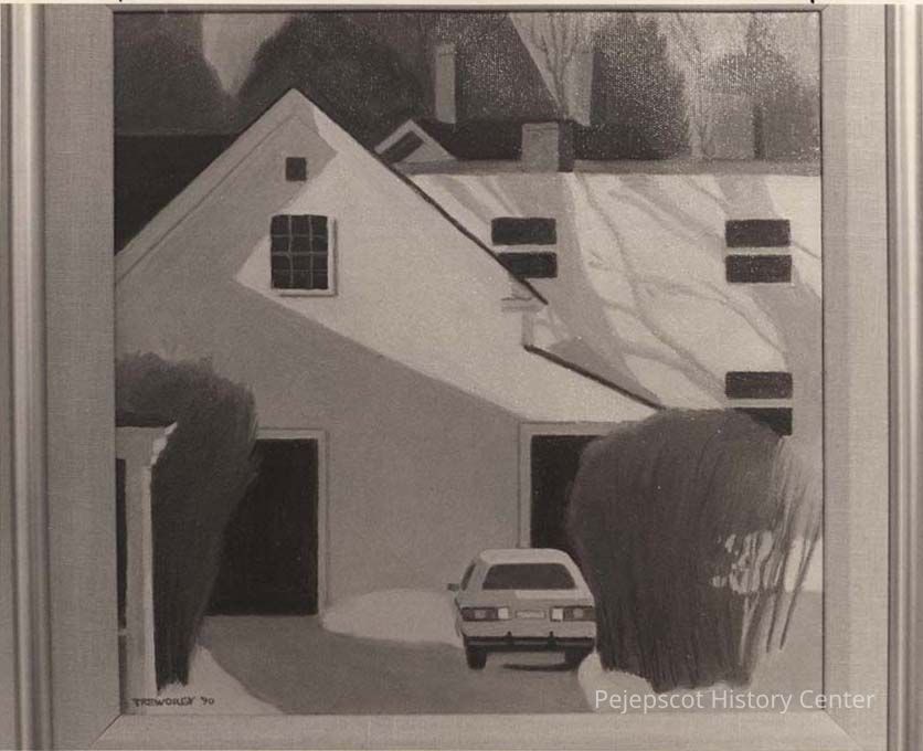 A black and white photograph of Mary Alice Treworgy's oil painting entitled, "Mrs. Wilson's Barn." Treworgy originally was born in Baltimore, MD, but lived much of her life in Brunswick. ME after graduating from the Massachusetts College of Art and Design with a BFA in Advertising and Product Design. Later, she would take painting classes at Bowdoin College, University of Southern Maine, and the Maine College of Art.