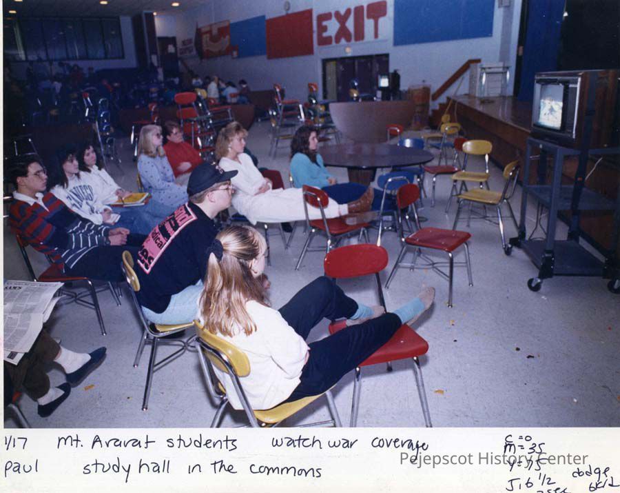 A color photo of Mt. Ararat students watching war coverage in the study hall in the Commons,Topsham, Maine, was taken in 1991.