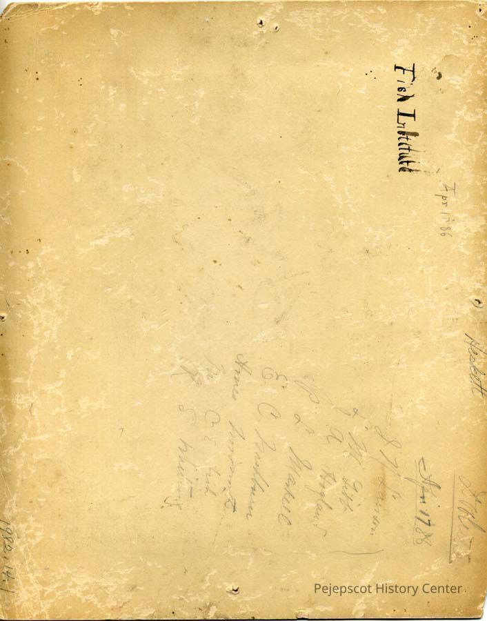 Black & white photograph of musical group, found in attic of the former Heskett House at 6 Columbia Avenue. Back reads, "Fish Institute April 17 [18]86. In picture: J.N. Lawson, L.M. Gibb, J.A. Hegland, P.L. Markell, E.C. Washburn, Ames Woodworth, M.C.E. Fish, R.S. Whitney".Lexicon