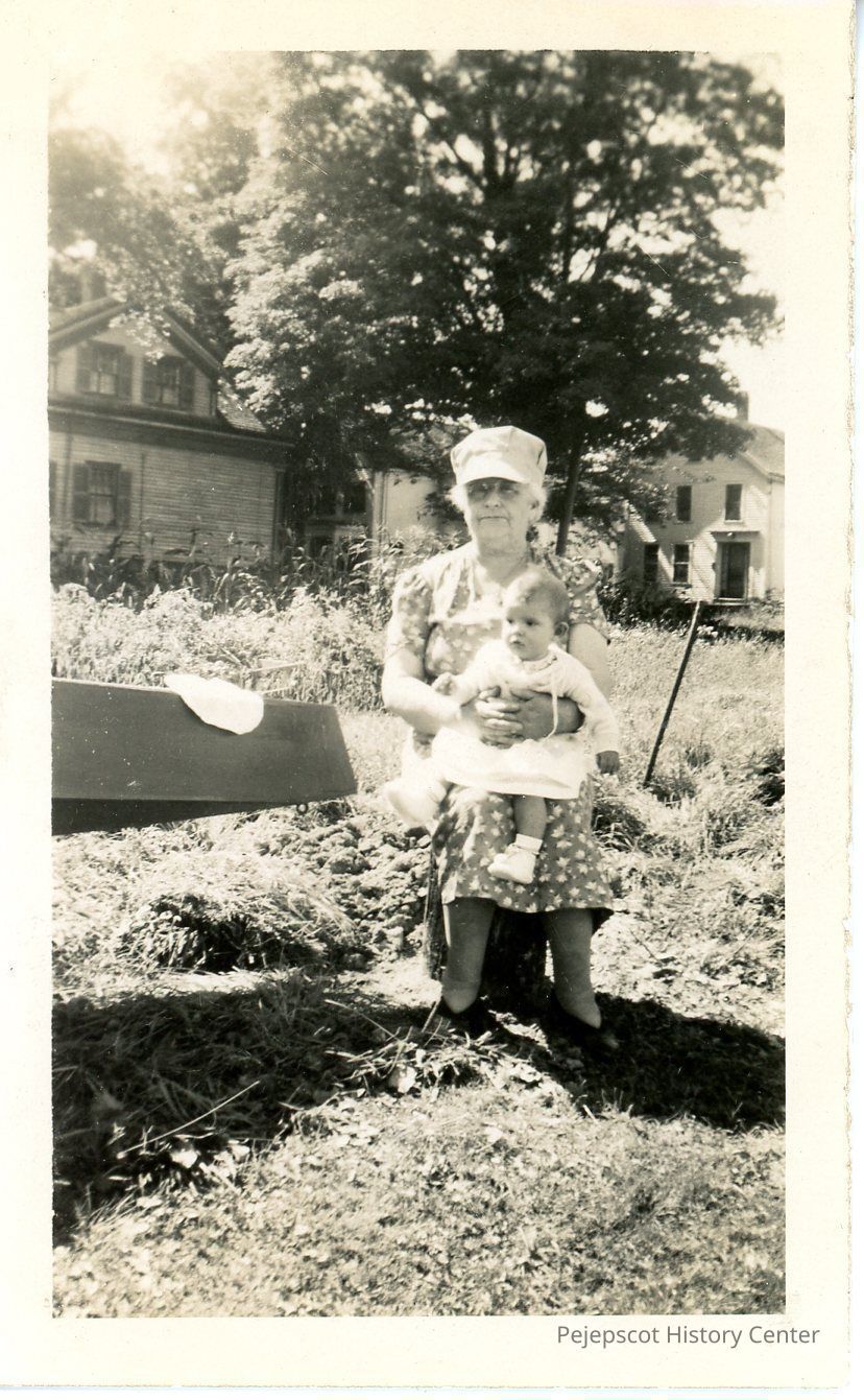 Myrtie Cutler and Sandy Good. A 2.25" x 4" photograph of a woman wearing a brimmed hat holding an infant in her lap while seated in a yard with several buildings in the background. A note on the back of the photo gives the location as "Bob and Evelyn's house in Richmond."