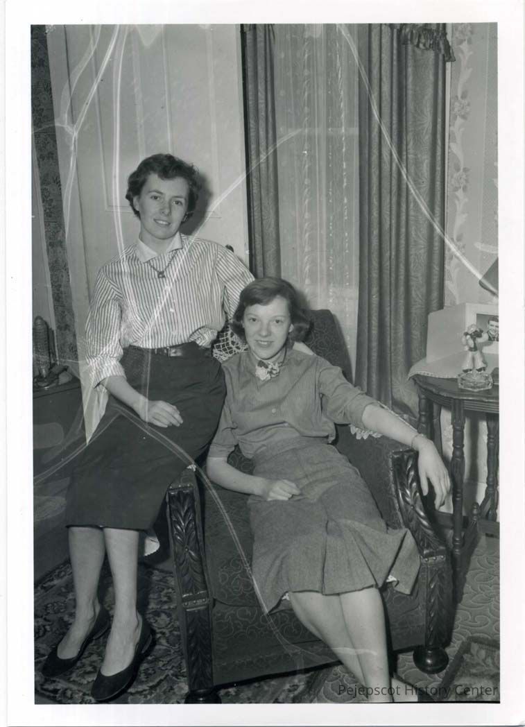 Nancy Raye sits in an overstuffed chair with Nancy Anderson perched on the arm on April 1, 1955.