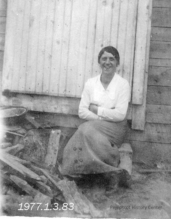 A B/W photograph of Naomi Stevens sitting near a wood pile. Undated