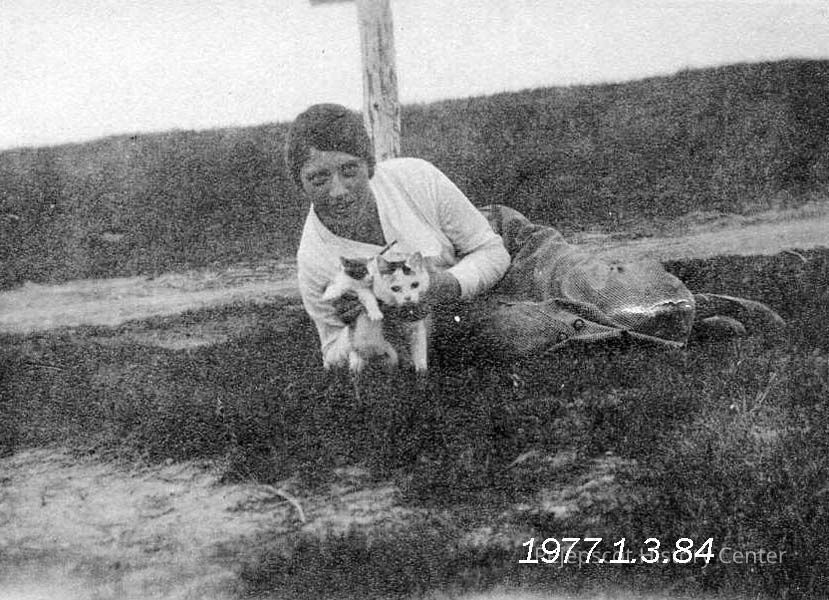 A B/W photograph of Naomi Stevens holding a cat and a kitten. Undated