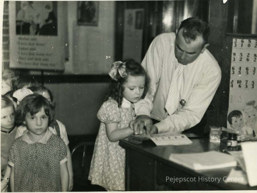A B/W photograph of Napoleon Gagne Jr. finger printing Constance Ouellette. 1937-38