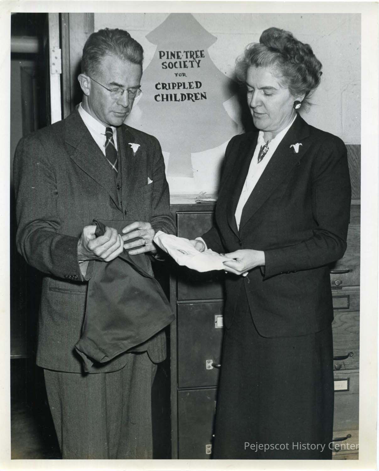 Nathan Dane and an unidentified woman stand in front of a sign reading "Pine Tree Society for Crippled Children."