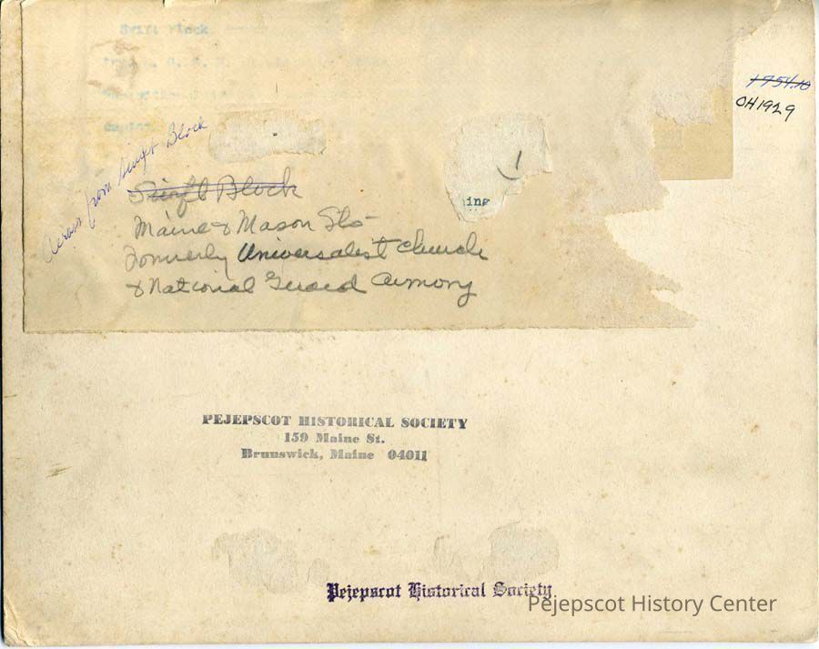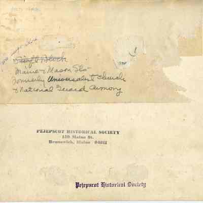A B/W photograph of the National Guard Armory at the corner of Maine and Mason Street, Brunswick, ME. The building was formerly the Mason Street Universalist Church until it suffered a fire in 1884, after which it was rebuilt without its steeple. Not dated.