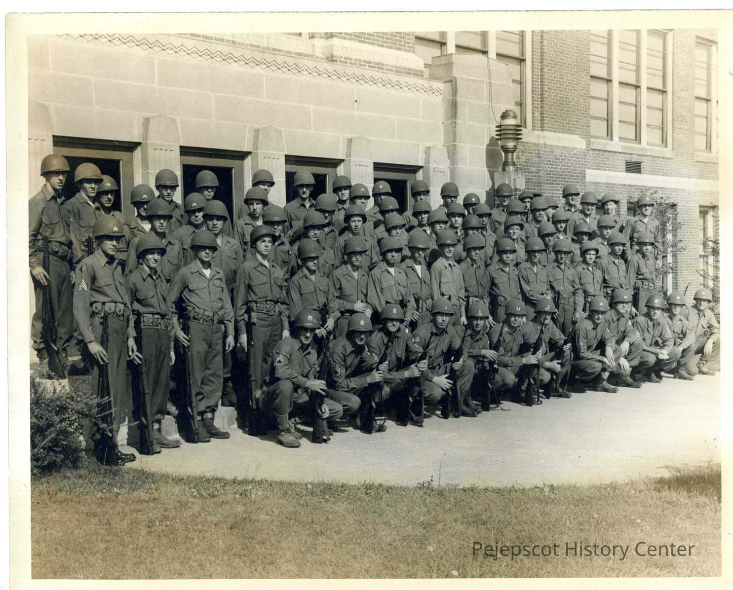 National Guard Unit, C Battery, 703 rd AAA Gun Batallion (9mm). Taken just before deployment, August, 1950. Went to Korea, Camp Gordon, GA, Camp Stewart, GA, and finally to New Jersey for the defense of New York City. The local boys are row 2; Desjardins, Lebeque, Belanger, Girard, Saucier, Bergeron, Thibeault, Coffin, Richard Holmes, Paul Saindon, Romeo Cloutier, Beaver Berry, Saucier, Richard Fortin. Row 3; Saindon, Blanchard, Desjardins, Frank Wallace, George Menard, Romain Soucie, ?, Russ Michaud, ?, ?, ?. Row 4; Martin, ?,?,?, Dick Marston, Dave Morin, Labbe, ?,?,?,?. Row 5; Dagenairs, Sam Bernier, ?, Ray McCrum, ?, Rusty Dionne, Bob Butte.Lexicon