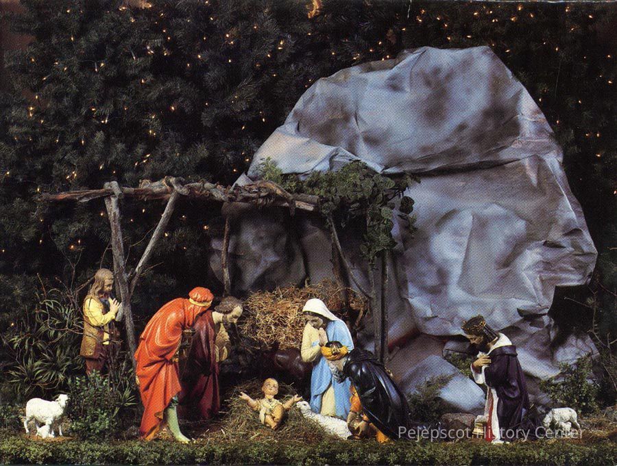 A Christmas card featuring a color photo of a nativity scene at St. John's Church in Brunswick, photographed by Tom Jones. The inside of the card has printed "Merry Christmas and a Happy New Year."