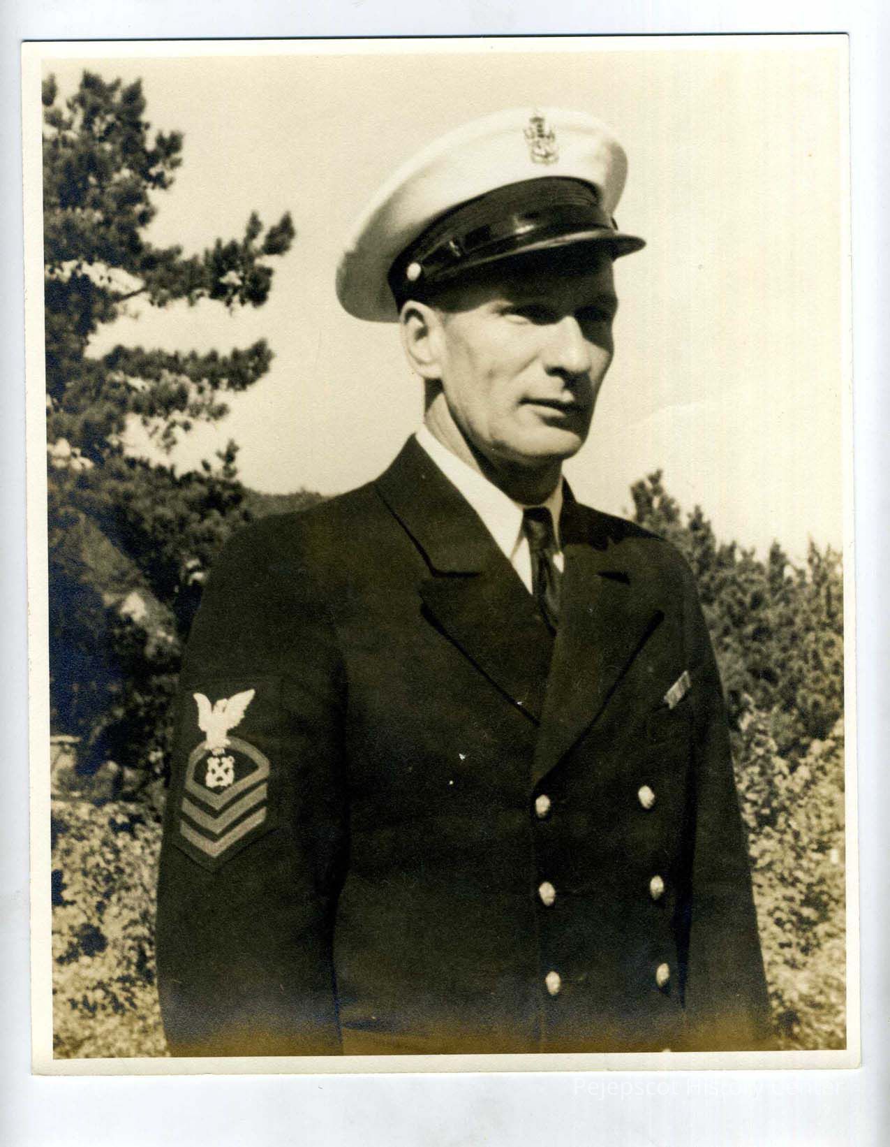 A waist up photo of a Naval officer taken outside. Brunswick Naval Air Station appears on the back of the photo. Undated