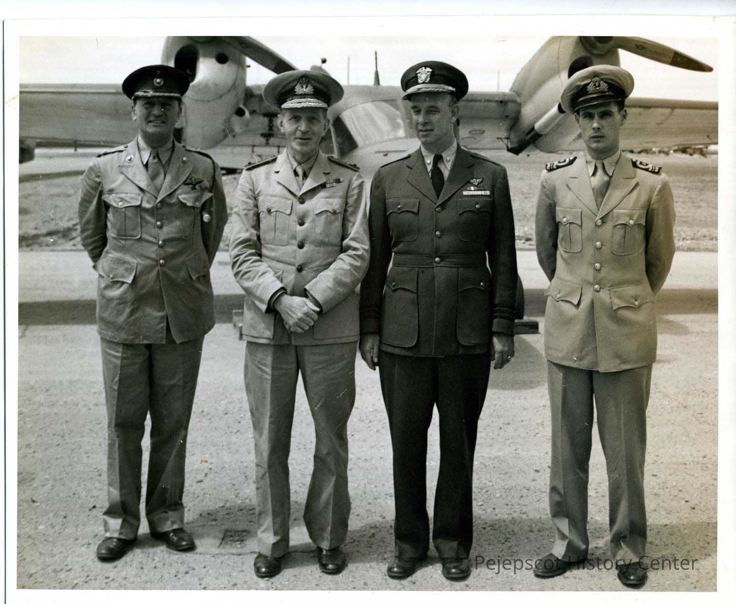 A photo of four officers. From left to right they are Major N. Martin, Royal Marines and Senior British Naval Officer at U.S, Naval Air Station, Squantum, Massachusetts; Rear Admiral J.W.A. Waller, R.N., British Admiralty Maintenance and Supply Representative; Commander J.C. Alderman: and Lt. Commander Kenneth Firth, Senior British Naval Officer at Brunswick Naval Air Station (BNAS). UndatedLexicon