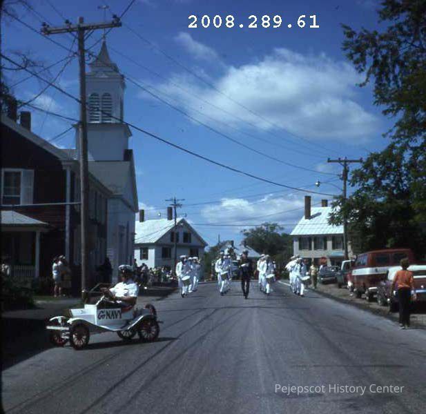 A color slide of a Navy Marching Band in a parade in Topsham. Marked on the slide 10/1975.