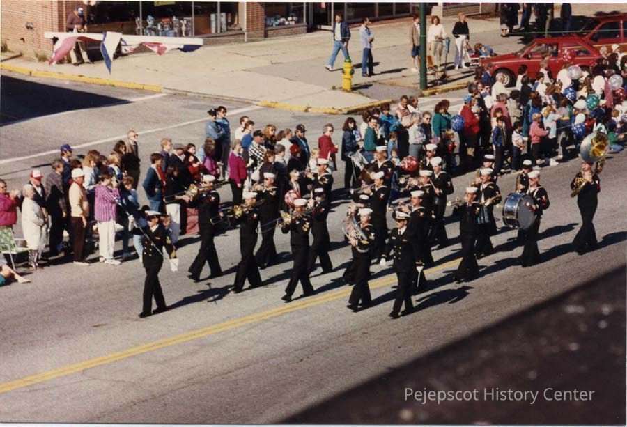 A color photograph of the crowd watching the Navy marching band in the 250th parade. 10/07/1989 Corner of Maine Street and Town Hall Place.