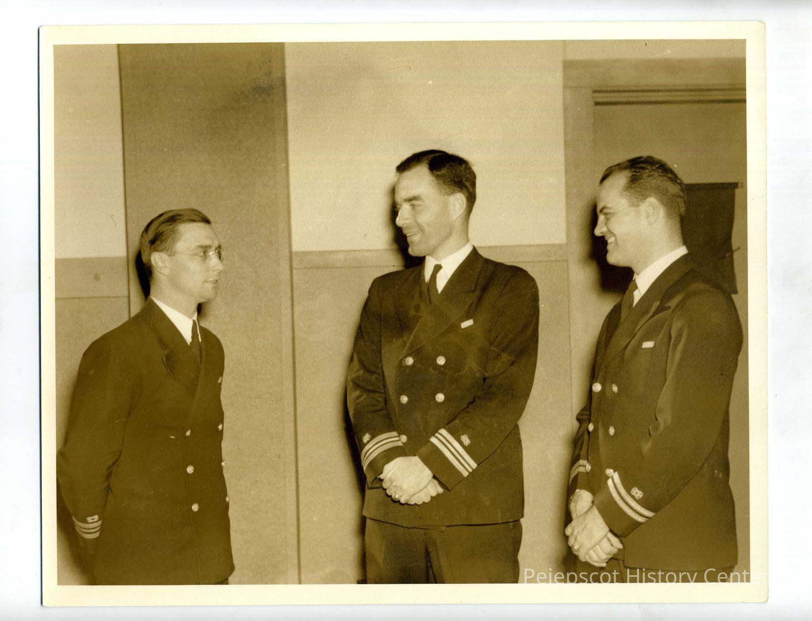 Three navy officers stand talking. Undated