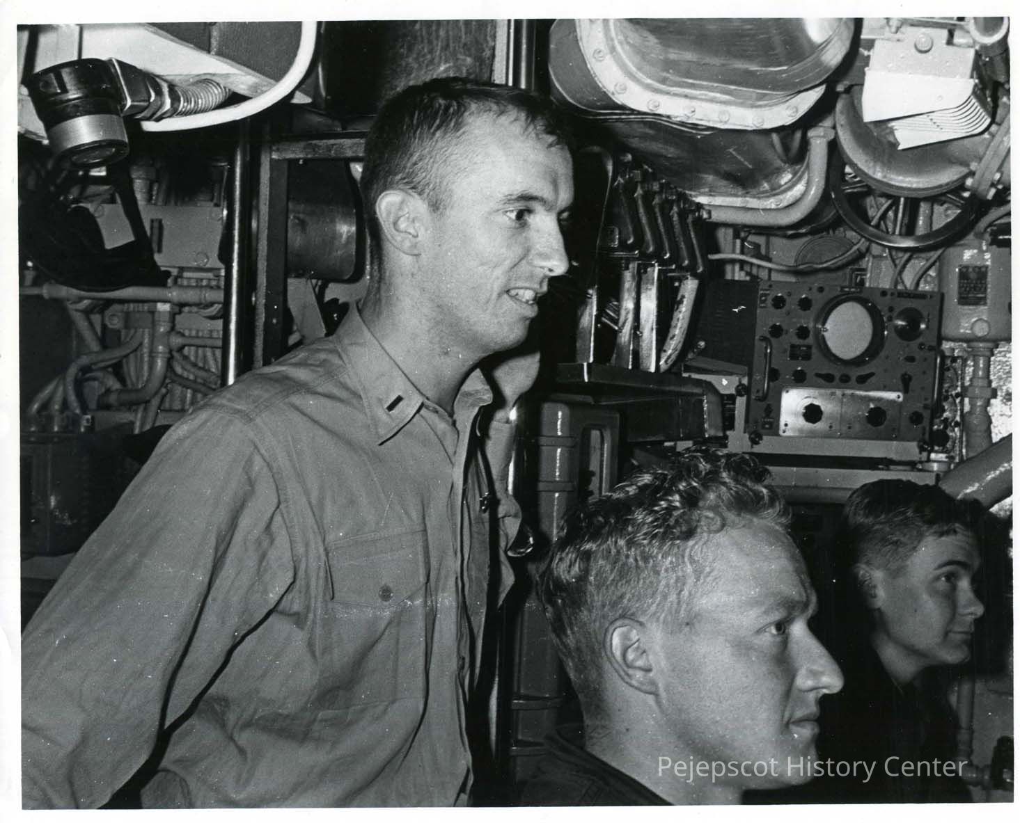 Three Navy men (one standing and two sitting) are surrounded by and focused on radio or radar equipment. The space looks fairly confined so it may be on board a craft of some kind. The back bears two stamps. "U.S. NAVAL AIR STATION BRUNSWICK, MAINE" and "OFFICIAL U.S. NAVY PHOTOGRAPH NOT FOR PUBLICATION UNLESS OFFICIALLY RELEASED." Undated