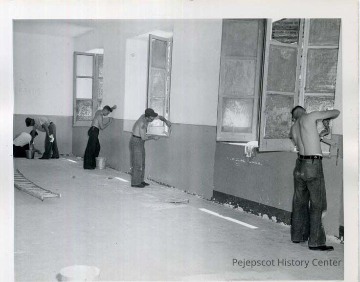 Five Navy men paint a room -- two on the windows and three on the walls. The back is stamped "OFFICIAL U.S. NAVY PHOTOGRAPH NOT FOR PUBLICATION UNLESS OFFICIALLY RELEASED." Undated