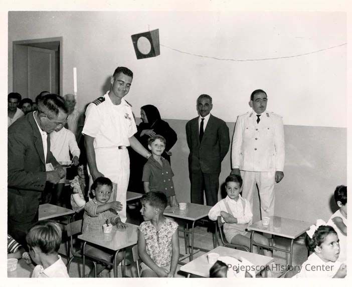 A navy officer visits a school room along with some other adult civilians. The school may be in a foreign country. Stamped on the back is "OFFICIAL U.S. NAVY PHOTOGRAPH - NOT FOR PUBLICATION UNLESS OFFICIALLY RELEASED." Undated