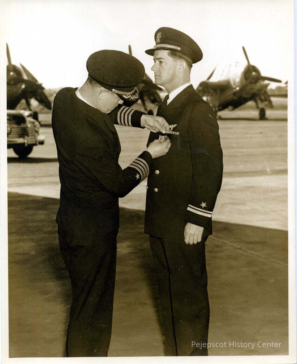 Two navy officers standing on an airfield at B.N.A.S. One is pinning a medal on the other. The back of the photo reads "AIRCRAFT TBM'S B.N.A.S. USNR A/C TBF/TBN-3 ADBENGERS." Undated