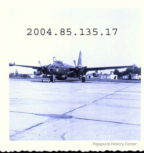 A small B/W photograph of a large plane sitting on a runway at Brunswick Naval Air Station