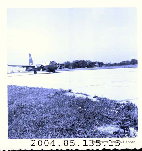 A small B/W photograph of a large plane at Brunswick Naval Air Station