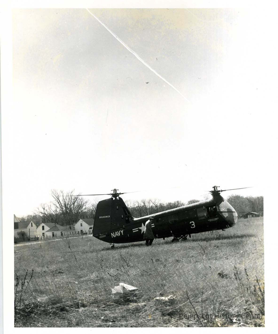 A black and white photo of a Navy Search Air Rescue Helicopter, PIASKIA-HU-16, sitting in a field where Jordan Acres school was later built. The helicopter appears to be picking up an officer. Undated