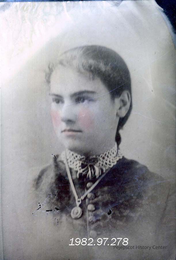 A colorized photograph of Nellie A. Peterson, daughter of John Peterson on Union St. in Brunswick, cousin of A.R.T's (Alice Pennell Toothaker?) mother.