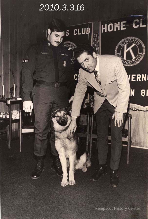 A B/W photograph of Airman Nelson Morrison with police dog "Mike" and Police Lt. Lawrence Joy. Photo was published 2/2/1972. Undated