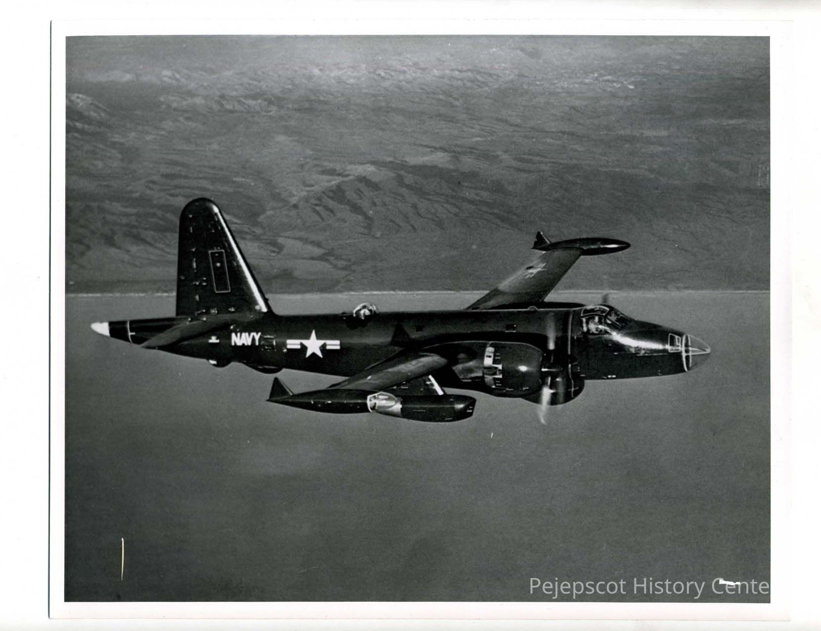 A mission bound AP-2V-7 "Neptune" heads out over the Pacific ocean leaving the California coast in the background. It is on a routine training mission. This aircraft is specially designed for anti-submarine search and attack. It carries a crew of four officers and six enlisted men for most patrols. The back of the photo bears two stamps - "U.S. NAVAL AIR STATION BRUNSWICK, MAINE" and "RELEASED IF PUBLISHED CREDIT MUST BE GIVEN AS FOLLOWS 'OFFICIAL PHOTOGRAPH U.S. NAVY.' Undated