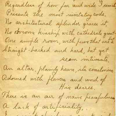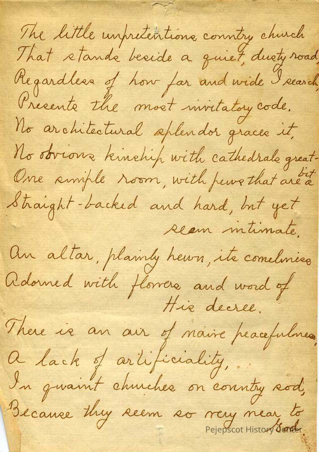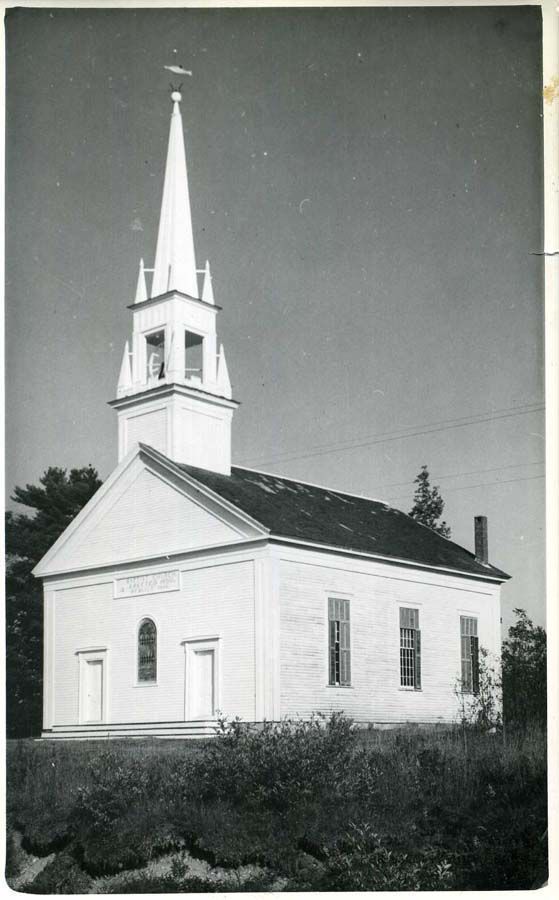 An undated black and white photo of the New Meadows Church on Coombs Road in Brunswick. There is a poem on the back of the photo (see accompanying photo file).