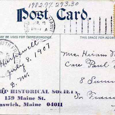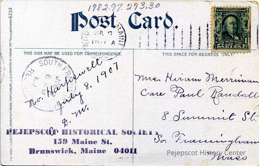 Color postcard of the steamer boat "Merryconeag" at the Gurnet Bridge on the New Meadows River. To: Mrs. Hiram Merriman, care Paul Randall, 8 Summit Street, So. Framingham, Mass. Postmarked Brunswick, July 8, 1907. "No. Harpswell, July 8, 1907. D.W."Lexicon