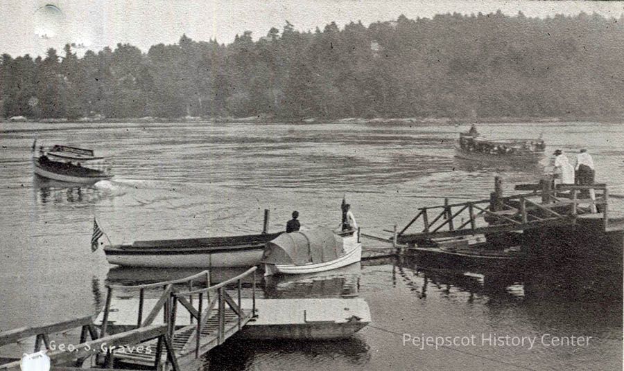 A B/W photo of Steamers leaving Gurnet on the New Meadows River for New Meadows Inn.